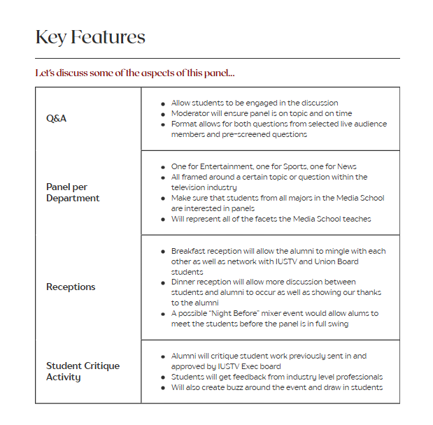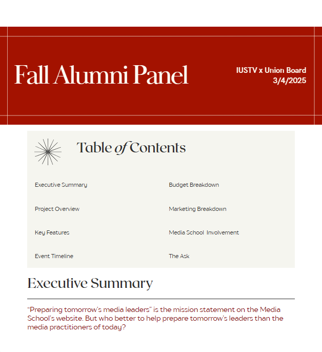 Part of my work as IUSTV Public Relations Director was communicating with our illustrious alumni network. I had the opportunity to plan and pitch a few different alumni events. This is an example of a pitch that I created for a potential event.