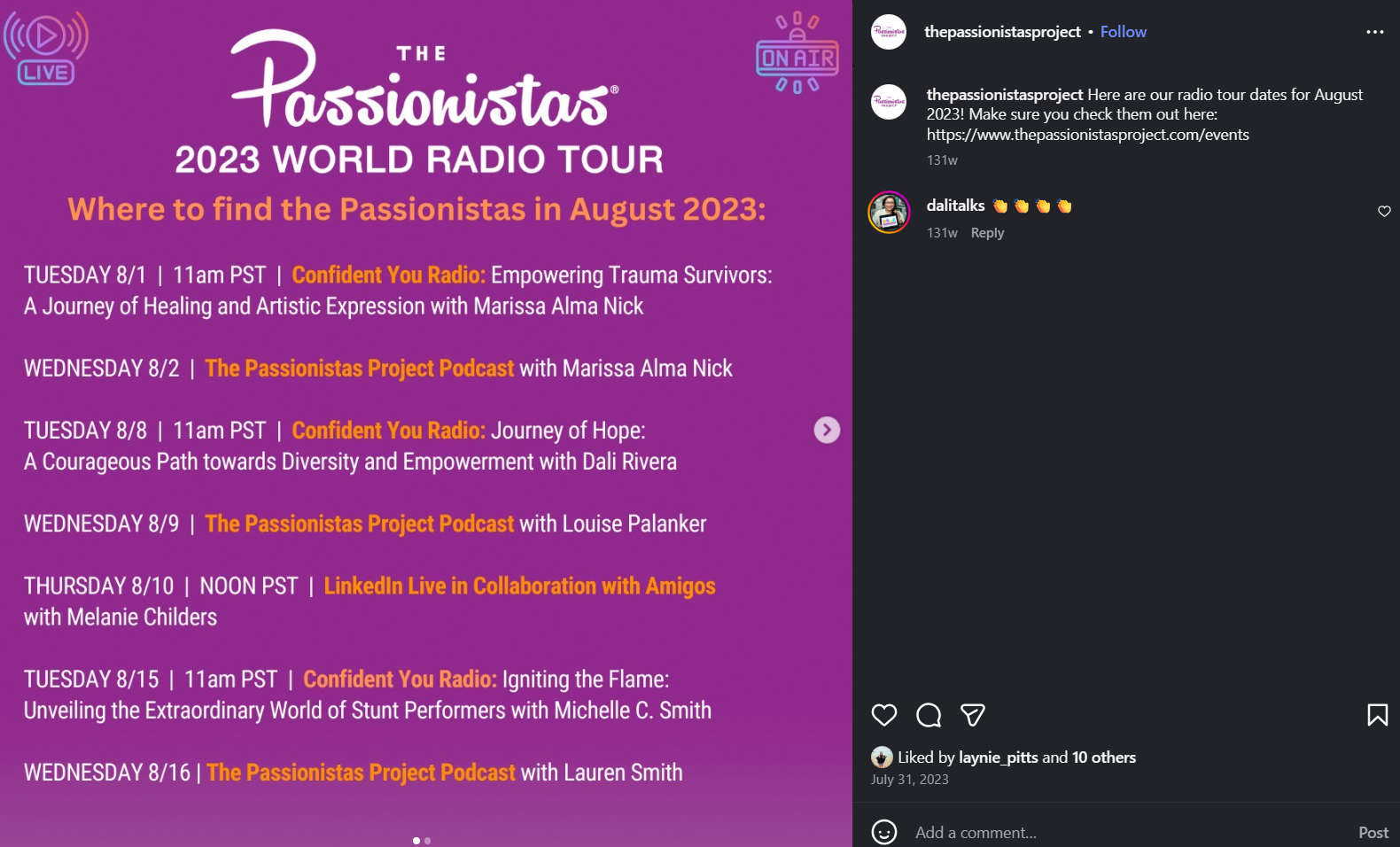 When I came on board, the Passionistas Project had several ongoing campaigns already. Here are a few examples of my impact on them. Their Instagram is @thepassionistasproject and my work is featured from August 2022-August 2023.